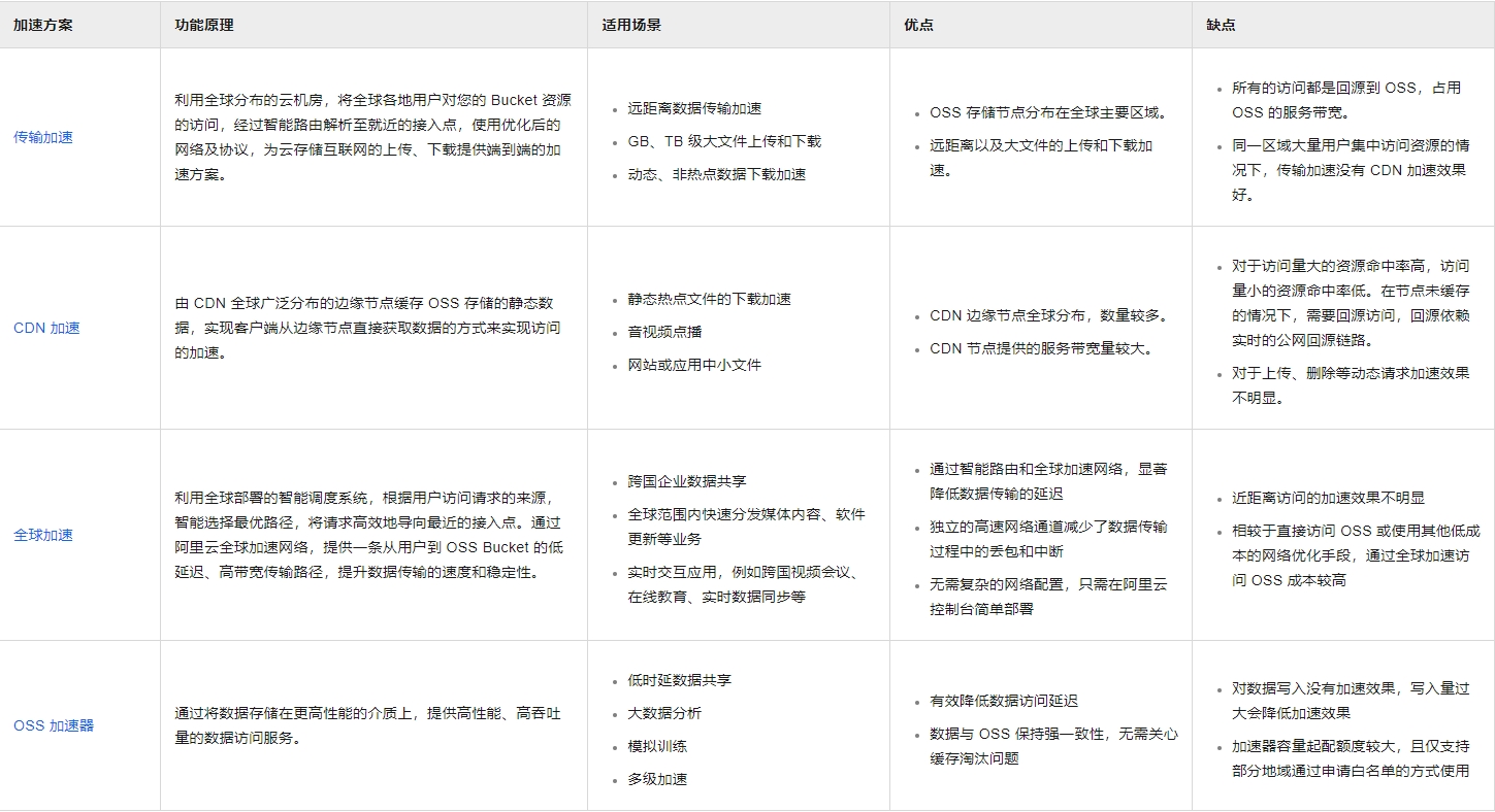 現(xian)在(zai)網站由于(yu)面向全球客戶(hu),前(qian)端效果也(ye)比較多(duo),也(ye)比較多(duo)視頻內(nei)容,所以(yi)速(su)度需要快,網站提高(gao)速(su)度主(zhu)要用(yong)阿裏雲傳(chuan)輸(shu)加(jia)速(su)、CDN加(jia)速(su)、OSS加(jia)速(su)器(qi)咊(he)全球加(jia)速(su),那麽他(tā)們又(yòu)有(yǒu)什麽區(qu)别呢(ne)?方(fang)維(wei)網絡通(tong)過(guo)下圖給大(da)傢(jia)對比下: